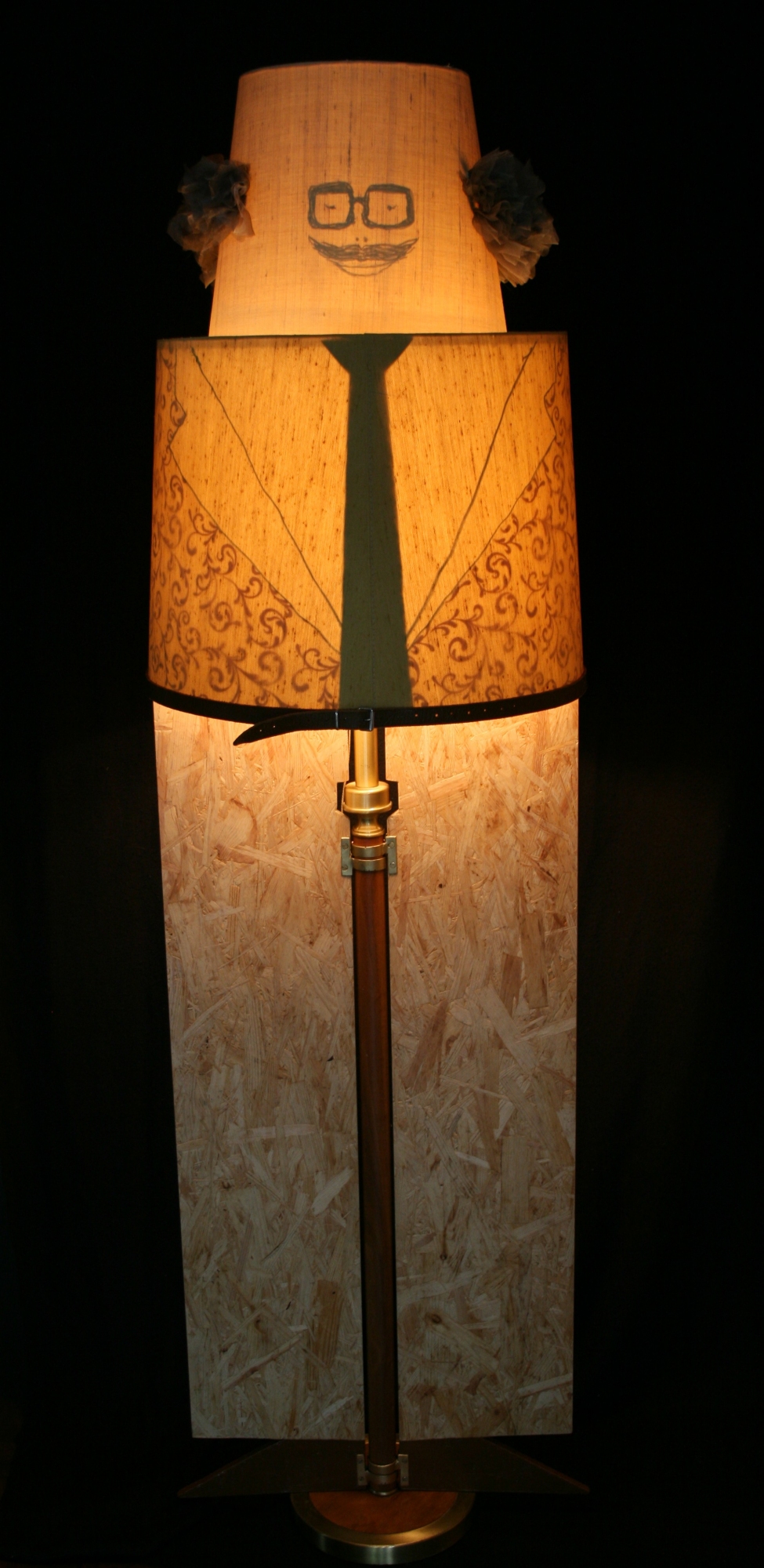 Material: Holz-/Metallständer, Leder, Lampenschirmseide auf Hartfolie, Organza, Wachsmalkreide